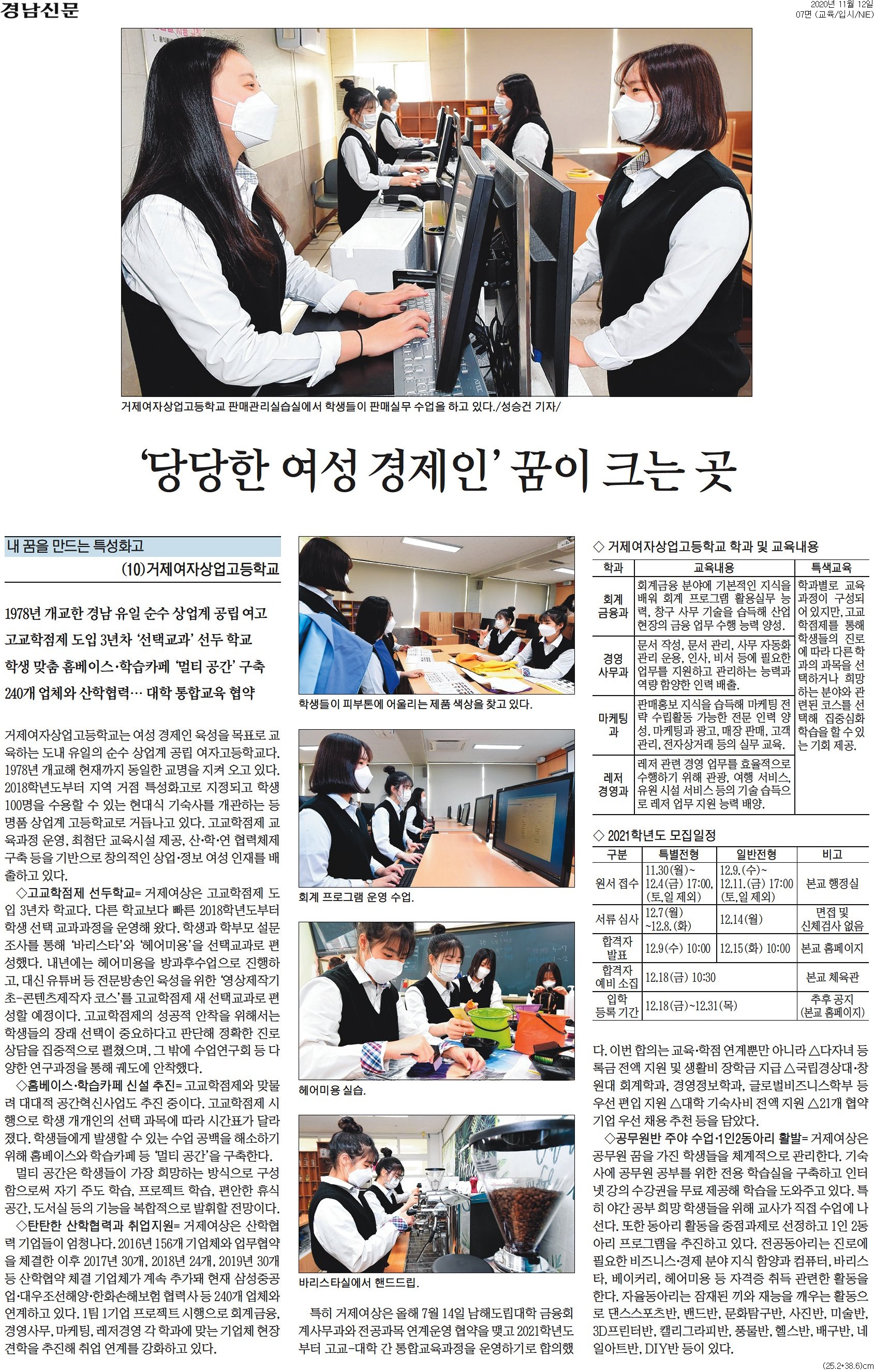 거제여자 상업고등학교 명품고등학교로 거듭나고 있다! ★ 2018학년도부터 지역 거점 특성화고로 지정되고 학생 100명을 수용할 수 있는 현대식 기숙사를 개관하는 등 명품 상업계 고등학교로 거듭나고 있다. ★ 공무원반 주야 수업으로 거제여상은 공무원 꿈을 가진 학생들을 체계적으로 관리한다. 기숙사에 공무원 공부를 위한 전용 학습실을 구축하고 인터넷 강의 수강권을 무료 제공해 학습을 도와주고 있다. 특히 야간 공부 희망 학생들을 위해 교사가 직접 수업에 나선다. ★ 탄탄한 산학협력과 취업지원= 거제여상은 산학협력 기업들이 엄청나다. 2016년 156개 기업체와 업무협약을 체결한 이후 2017년 30개, 2018년 24개, 2019년 30개 등 산학협약 체결 기업체가 계속 추가돼 현재 삼성중공업·대우조선해양·한화손해보험 협력사 등 240개 업체와 연계하고 있다. 1팀 1기업 프로젝트 시행으로 회계금융, 경영사무, 마케팅, 레저경영 각 학과에 맞는 기업체 현장 견학을 추진해 취업 연계를 강화하고 있다.